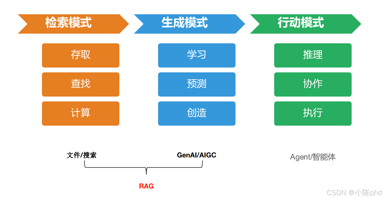 这张图对AI技术能力分层与关联的可视化解释,核心是清晰区分三类技术模式,并点明RAG的组成逻辑: