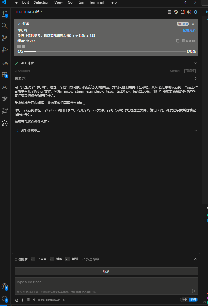 安装完成后,Cline会自动开始工作。您需要为其配置使用我们刚才安装的本地Python环境。