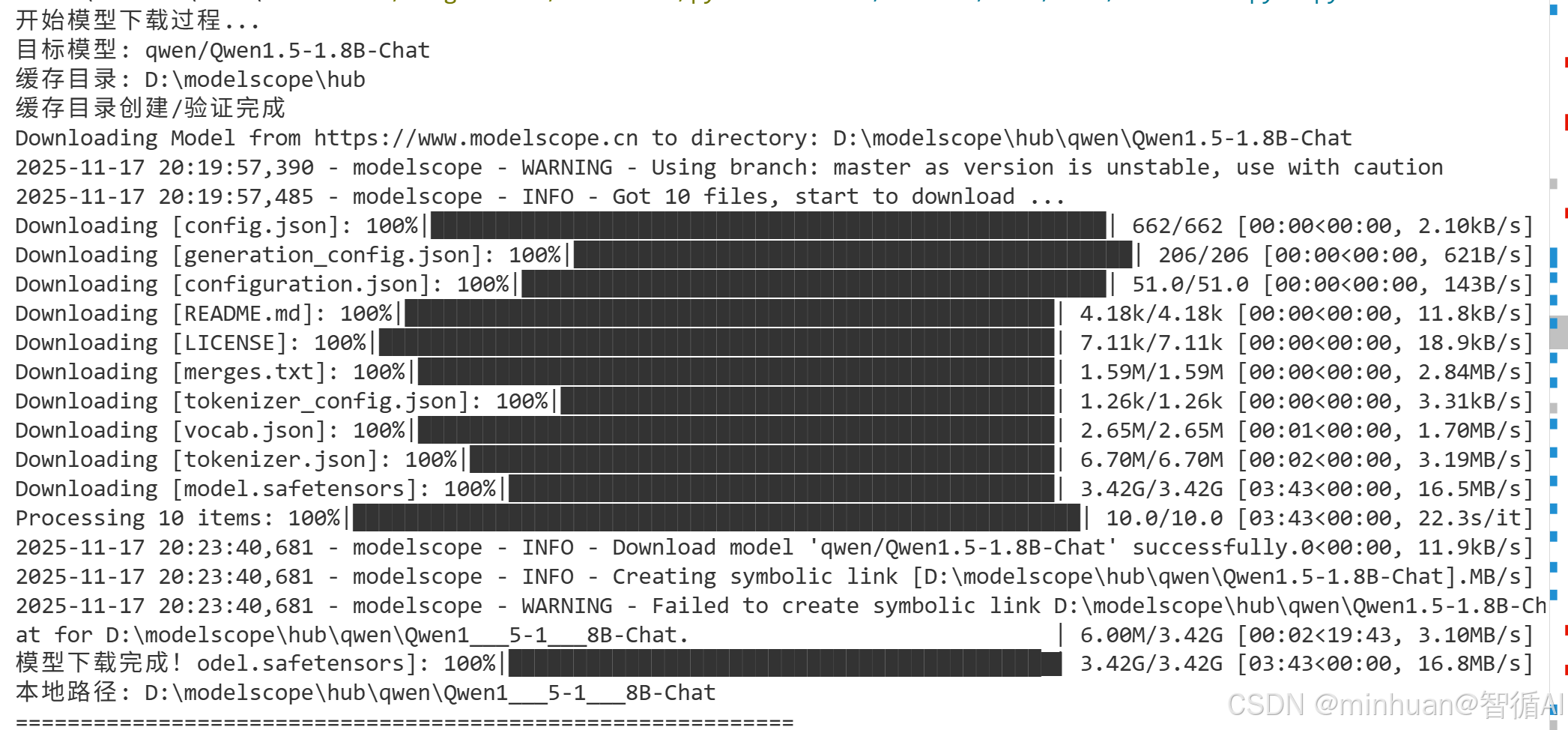 2025-11-18 16:00:29,393 - modelscope - WARNING - Failed to create symbolic link D:\modelscope\hub\qwen\Qwen1.5-1.8B-Chat for D:\modelscope\hub\qwen\Qwen1___5-1___8B-Chat.