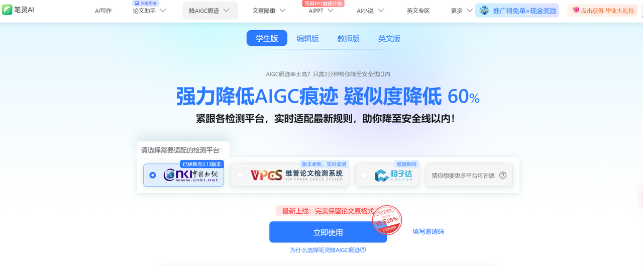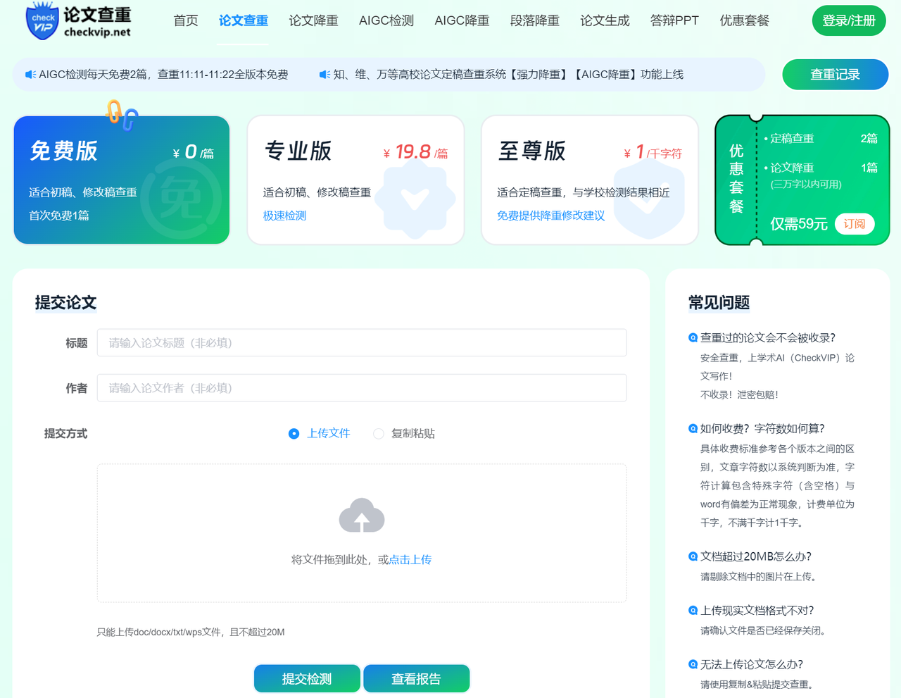 CheckVIP不仅能查重,现在也上线了AIGC降重功能。如果你的学校要求用维普或者万方查重,那用这个平台会比较方便,因为它的算法跟这些大厂比较接近。