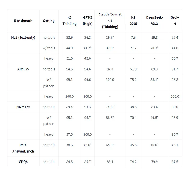 多项基准测试结果也印证了这一点:在“人类终极考试”(Humanity’s Last Exam)工具启用场景下,K2 Thinking 获得 44.9 分,超越 Claude Sonnet 4.5,且逼近 GPT-4.5。