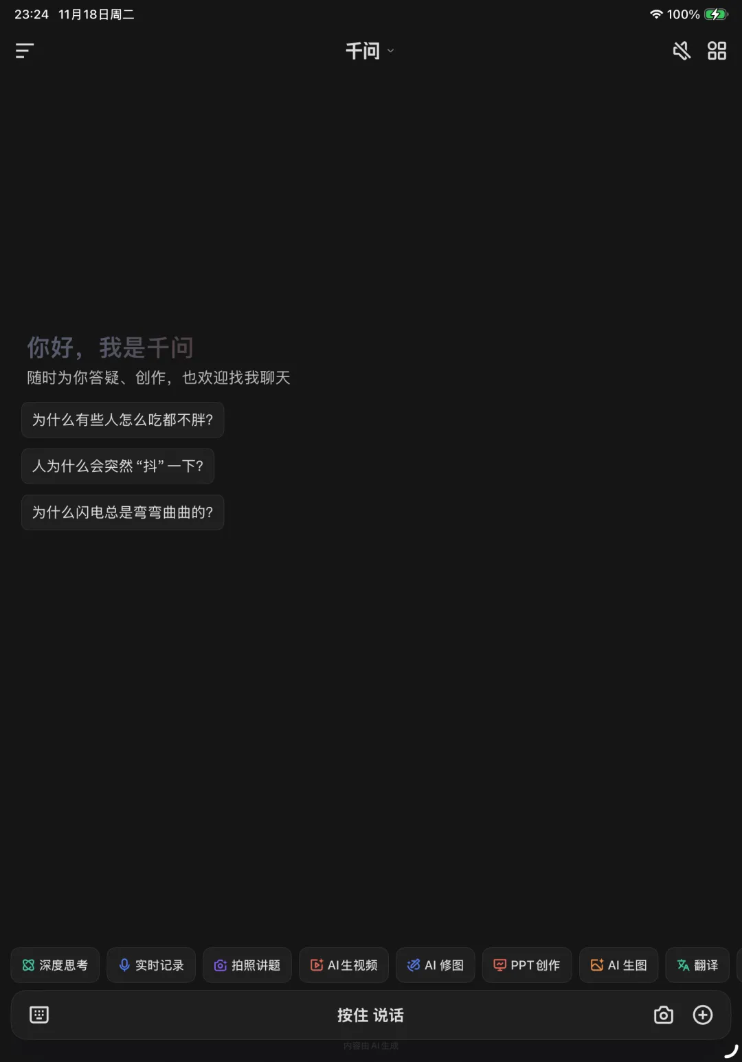 千问 APP 的界面设计贯彻了极简主义理念。打开 APP,第一感觉就是 "够简洁"—— 页面极简,交互轻量,没有眼花缭乱的功能,打开就是一个对话框。这种设计完全不像传统 APP 那样 "臃肿",而是将所有功能都整合在一个简洁的界面中。