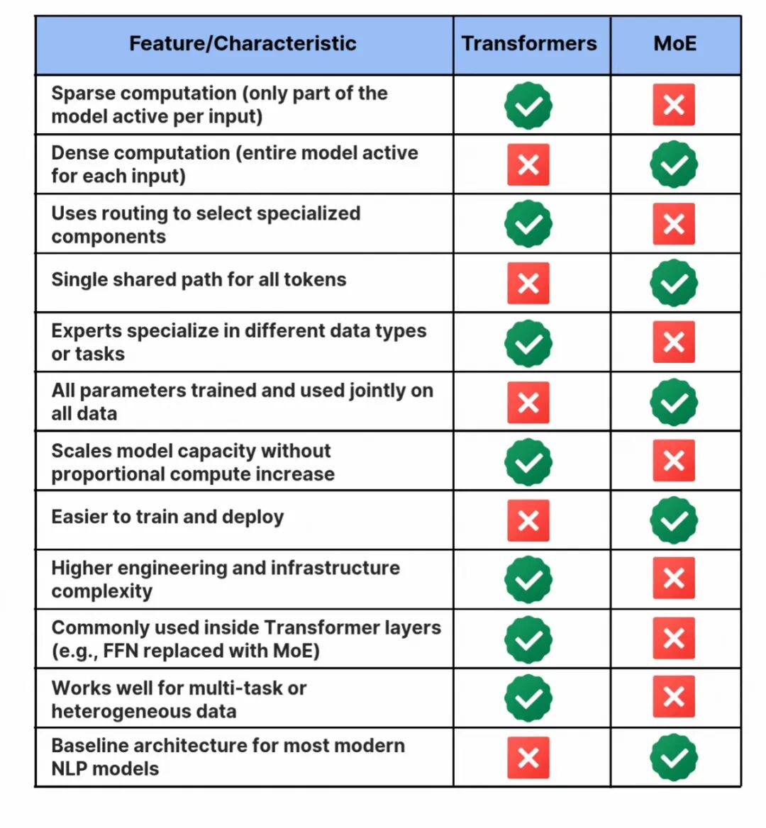 | 特性 | Transformer(密集模型) | 专家混合模型 (MoE) |