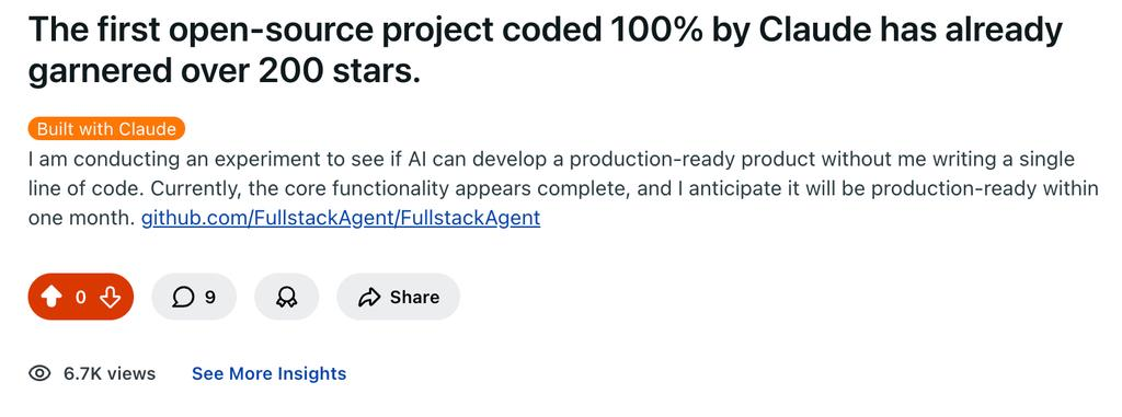 第一:100% AI 全生成的开源项目,居然也能有 star, 这还是挺夸张的,这意味着 AI 不仅能写代码,还能写出程序员认可的代码。(如果真的是和作者声称的那样)