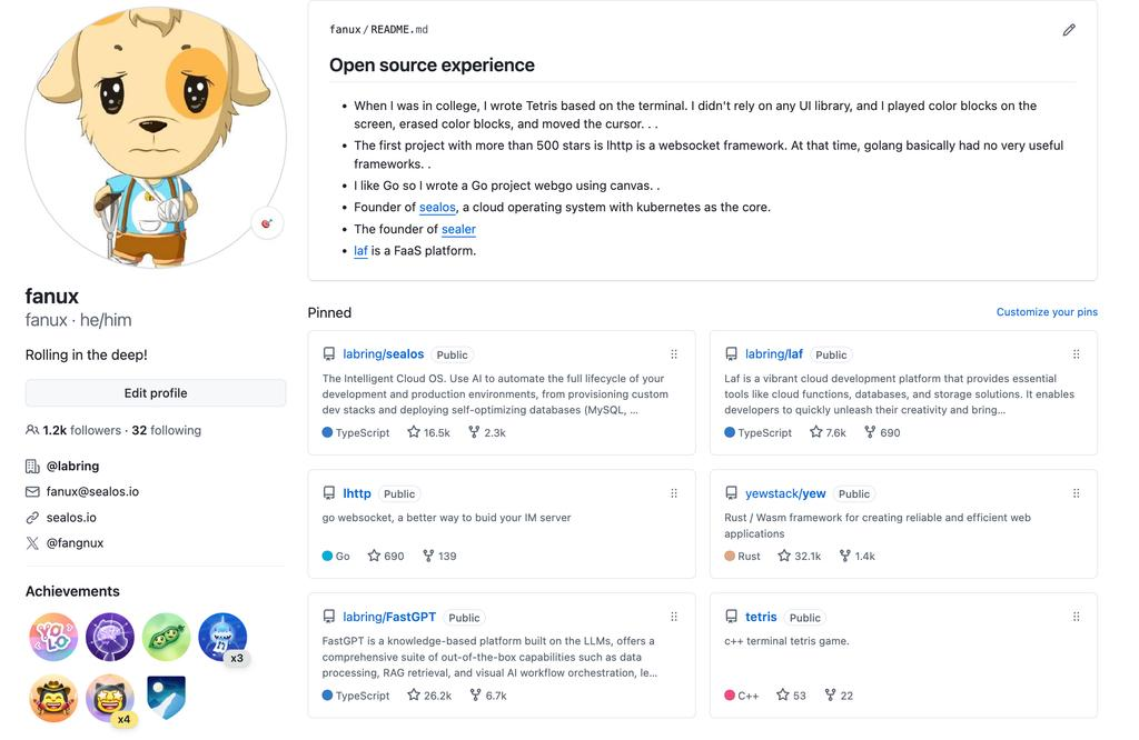好吧,这一切就合理了,他是 Sealos fastgpt laf 的作者, 5000 star 以上项目 3个… 那能短时间搞出这个就不奇怪了。