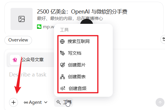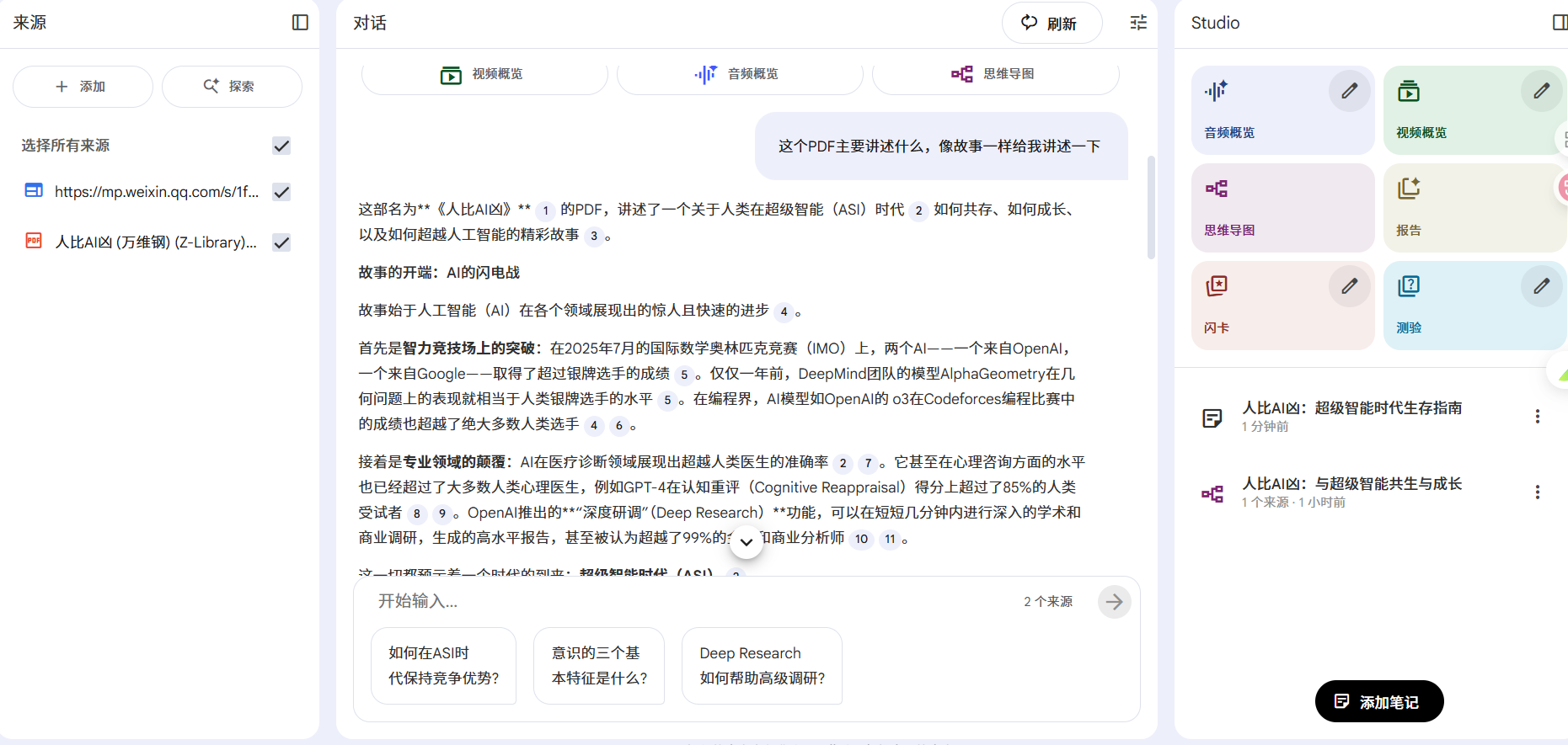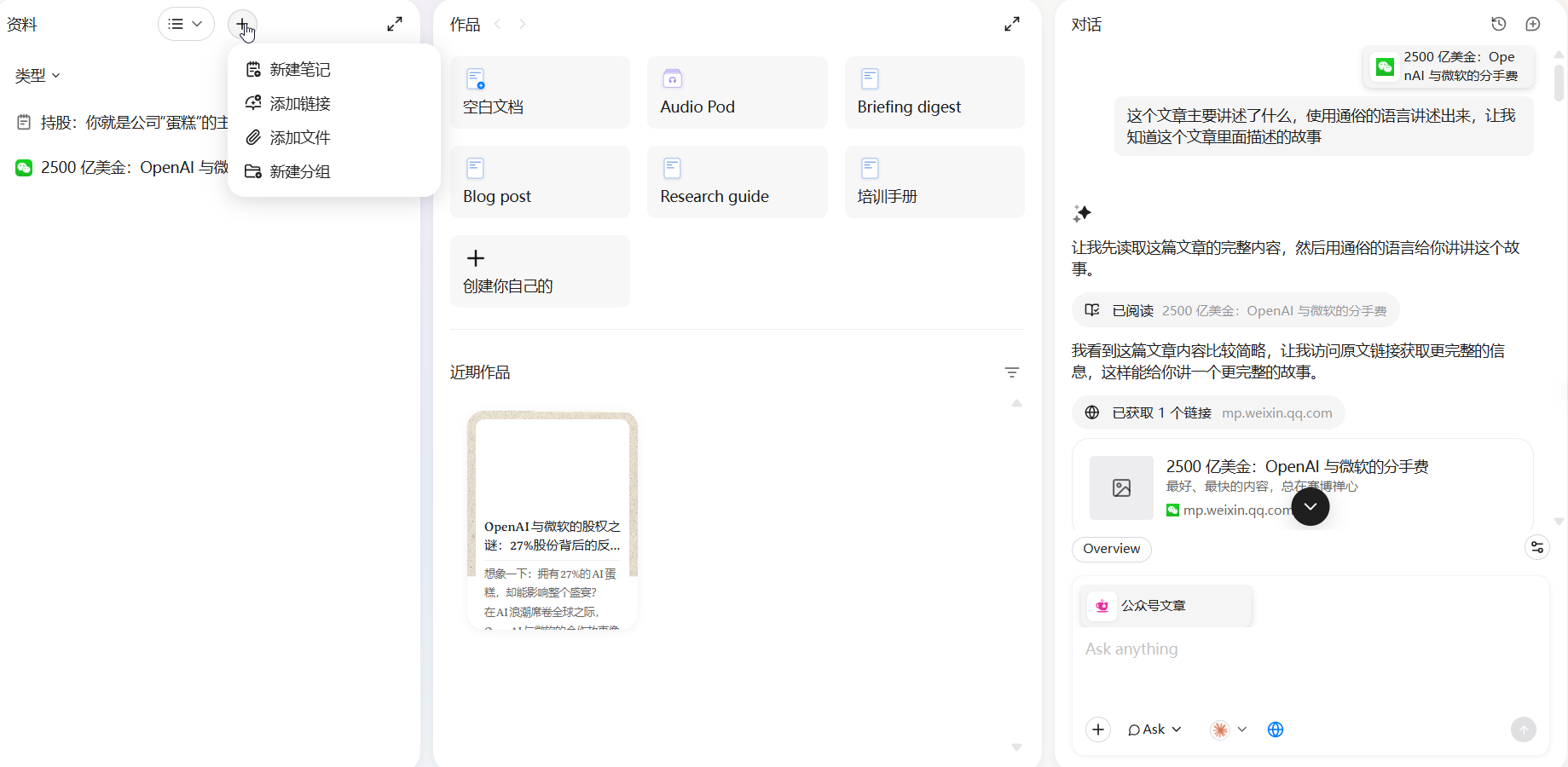 这个主要是集成AI功能的区域,选择左边的原始材料,使用AI进行加工,深入分析