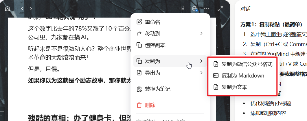 其次就是可以进行公众号创作,导出成为公众号的文章格式