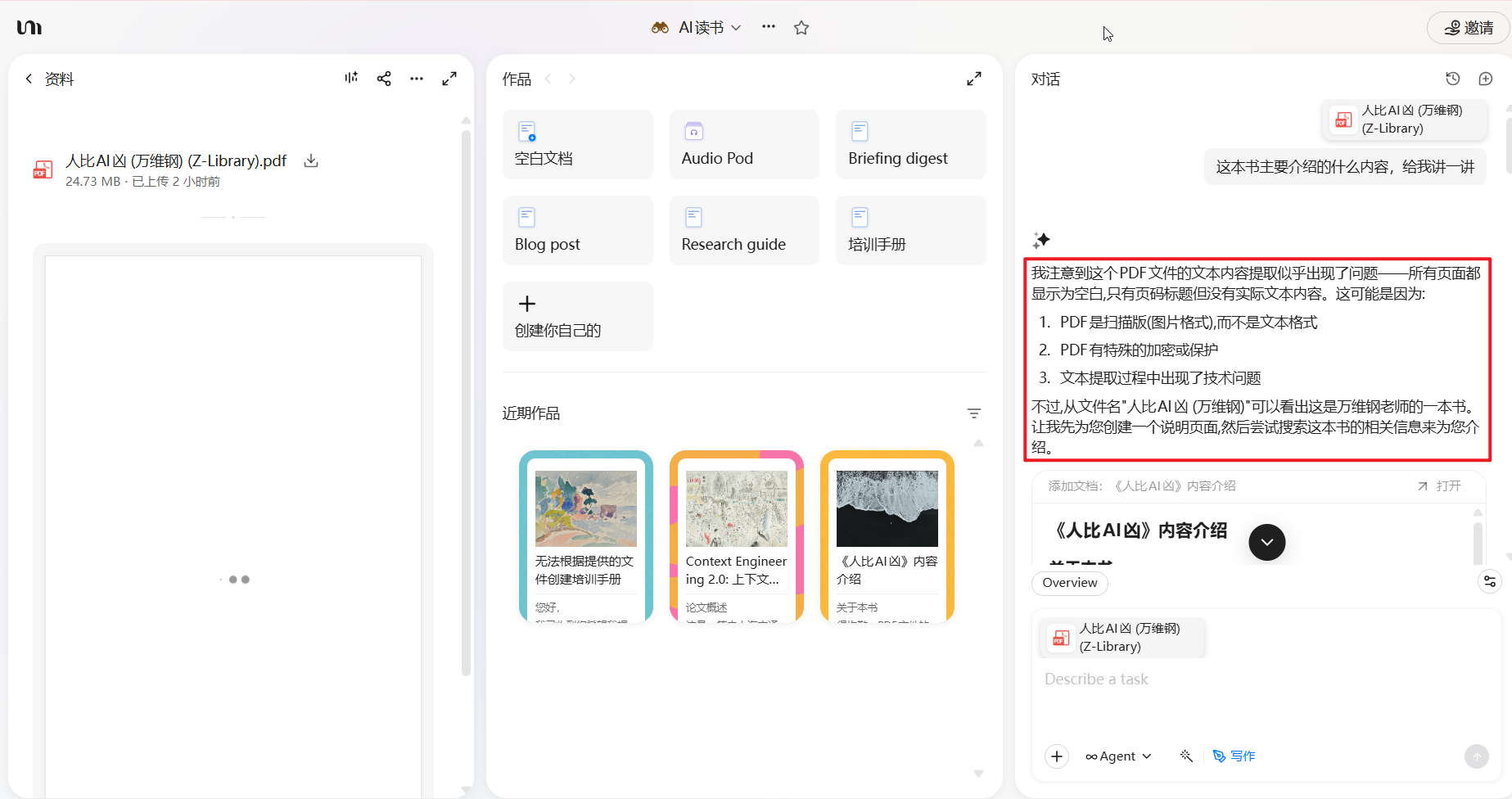 比如AI辅助读书,可能之前我介绍的ima知识库,notebookLM更加合适,youmind可能出现无法解析的错误,都是可能的,下面的这个案例,就可以说明这个问题;