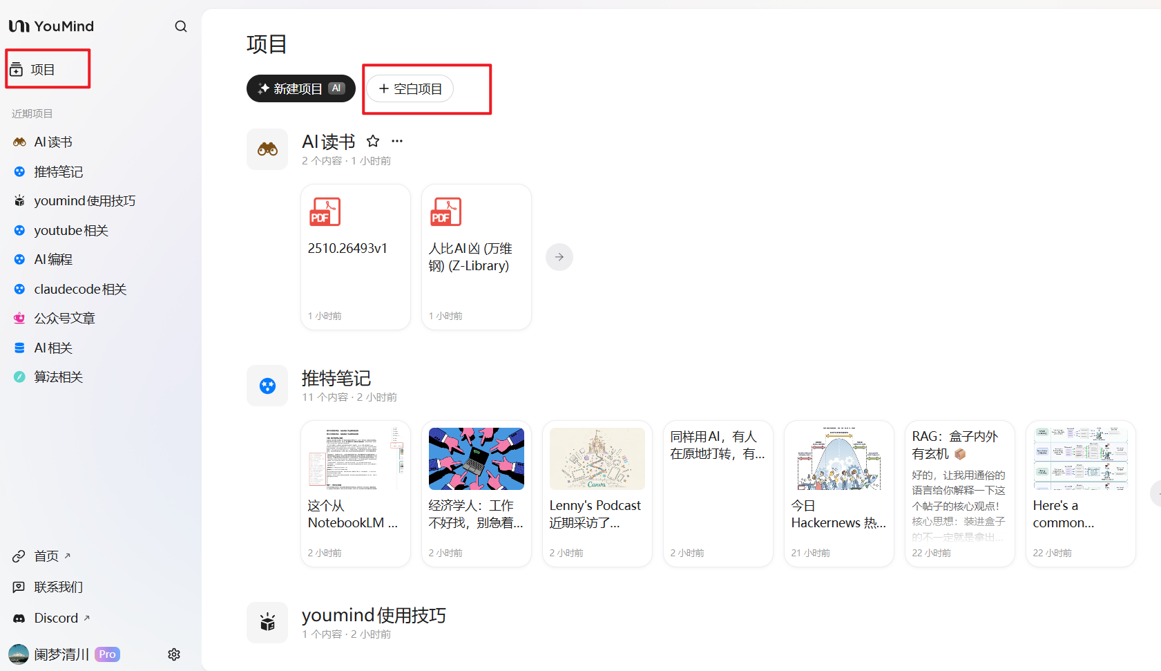youmind里面使用项目进行管理,类似于一个知识库,每一个项目可以是自己划分的一个主题的内容,你可以新建空白项目,比如自己的看到的不错的公众号文章
