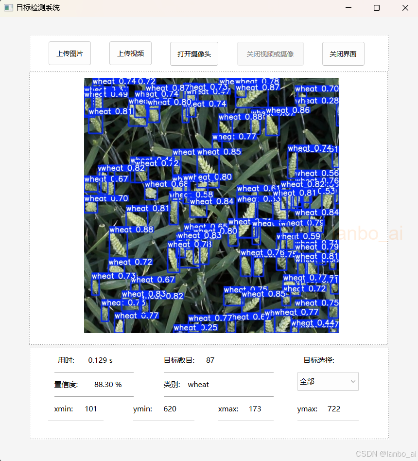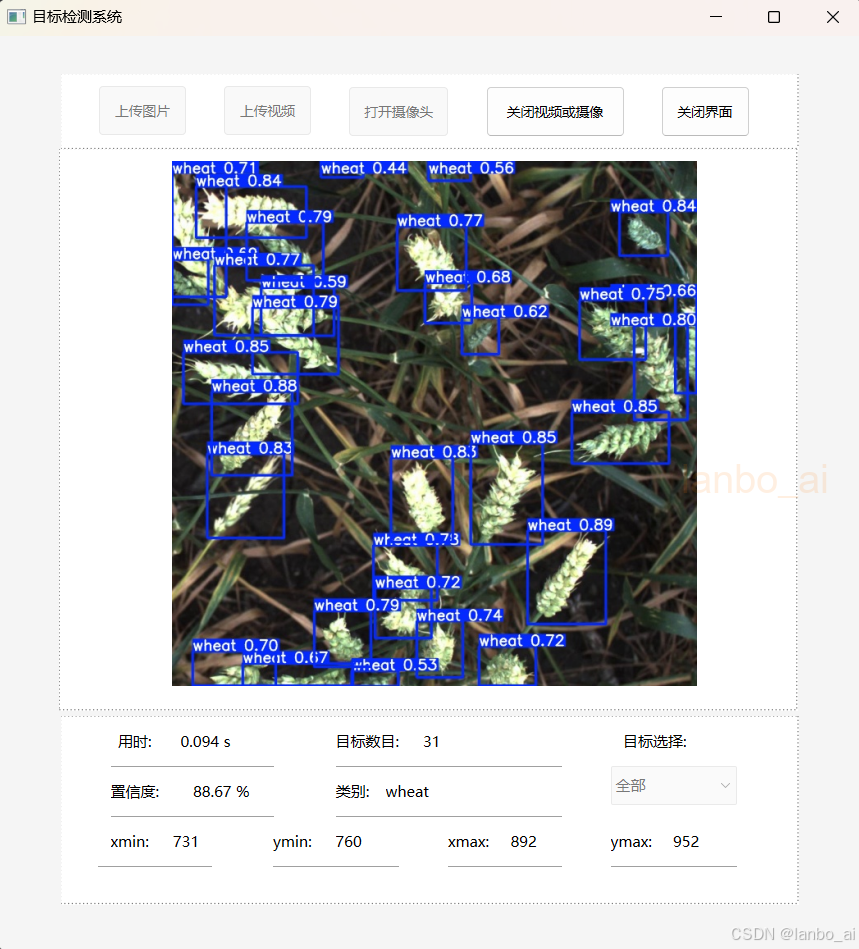 本文介绍了一个基于YOLOv8的小麦麦穗检测系统,采用PyTorch框架实现。项目包含完整代码、数据集、预训练模型权重、训练记录和简洁的PySide6 GUI界面,支持图像/视频/摄像头实时检测。系统提供模型训练验证全流程:修改数据集路径后运行train.py训练,val.py验证,最终通过GUI界面展示检测效果。核心功能包括图片上传、目标检测(显示检测时间、类别、置信度和坐标位置)、视频实时检测