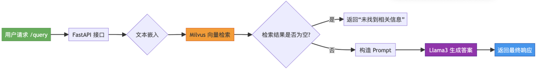 用户提问 → FastAPI 接收 → 文本嵌入 → Milvus 检索 Top-K 相关片段 → 拼接 Prompt → Llama3 生成答案 → 返回结果
