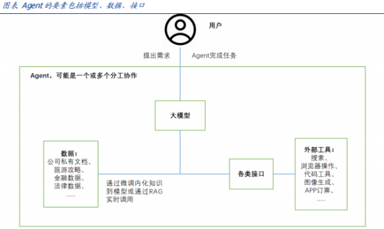 而三者我们在基础软件中前面便提到过,其中大模型决定着Agent的决策能力,数据是Agent能拓展到各行业的关键,接口则是与外部系统交互的各类接口(包括各通信/交互协议技术)。