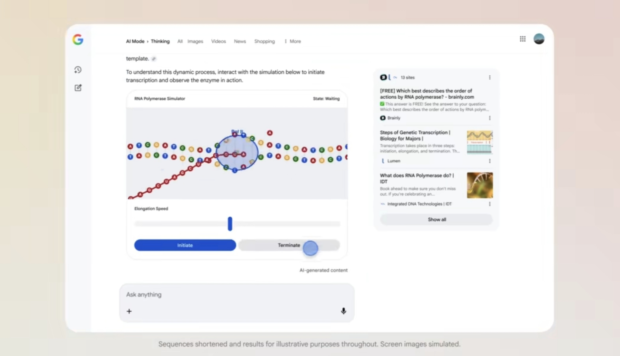 为了帮助你更好地理解网络上的信息,搜索中的 AI 模式现在使用 Gemini 3 来实现新的生成式 UI 体验,例如沉浸式视觉布局、交互式工具和模拟,所有这些都是根据你的查询即时生成的。