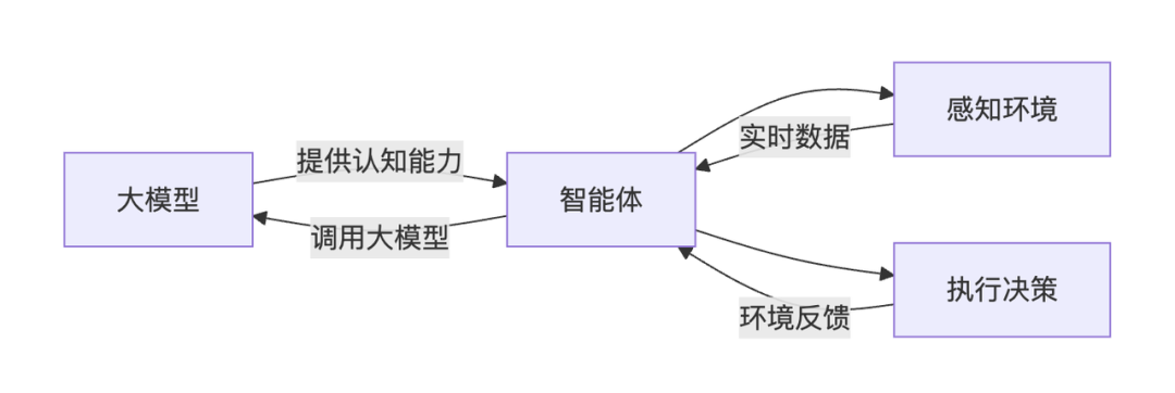 LLM为智能体提供认知能力,智能体则调用LLM,并负责连接感知环境与执行决策: