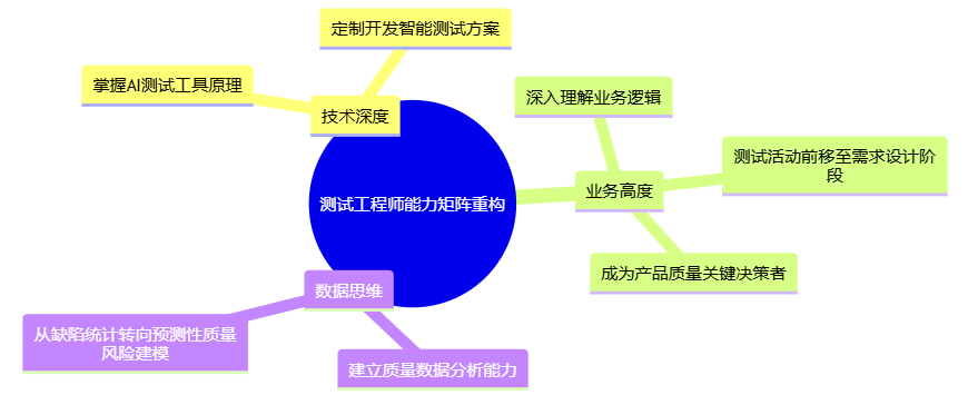 京东某业务线测试团队的转型实践具有借鉴意义:通过掌握智能流量回放、差异检测算法调优等技能,团队成功将60%的回归测试交由AI执行,自身则专注于复杂业务场景深度测试与用户体验优化,团队价值获得业务方高度认可。以下用思维导图展示测试工程师能力矩阵重构的方向: