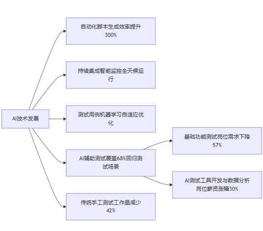 这一技术演进引发行业双重反响:一方面,重复性高、模式固定的测试任务正加速自动化,测试人员得以从繁重的重复劳动中解脱;另一方面,测试工程师的能力要求正经历根本性转变——仅掌握基础功能测试的工程师招聘需求下降57%,而精通AI测试工具开发与测试数据分析的岗位薪资涨幅达30%。以下用一张图展示测试行业在AI影响下的变化趋势: