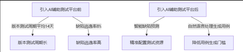 某金融科技公司的实践表明,引入AI辅助测试平台后,版本测试周期从平均14天缩短至6天,缺陷逃逸率从8%降至2.5%。测试工程师王明(化名)坦言:“我的工作重心已从执行数百个重复用例,转向设计更智能的测试策略与分析测试数据模式。”以下用流程图展示AI辅助测试带来的效率提升过程: