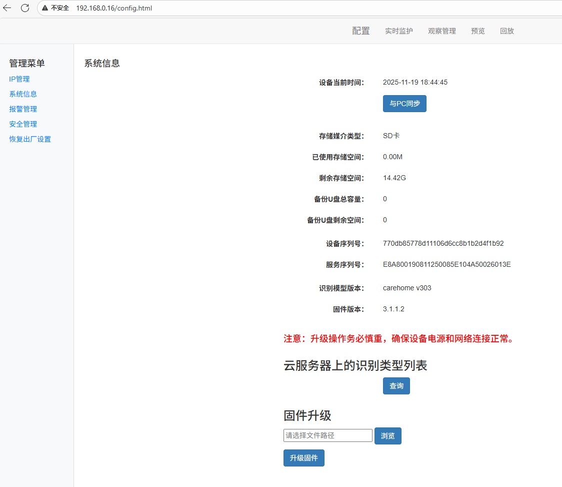 - config.html:设备网络/参数配置、固件升级、模型切换等