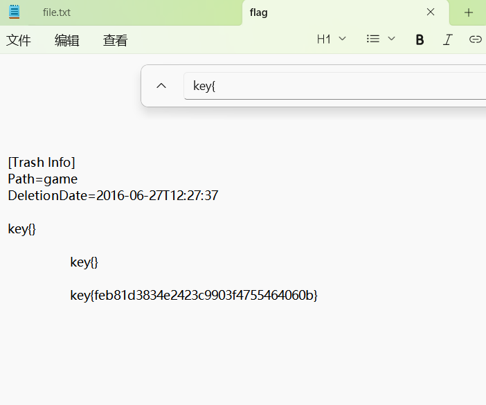 将解压文件中的flag文件传回本机再用记事本打开,搜索flag