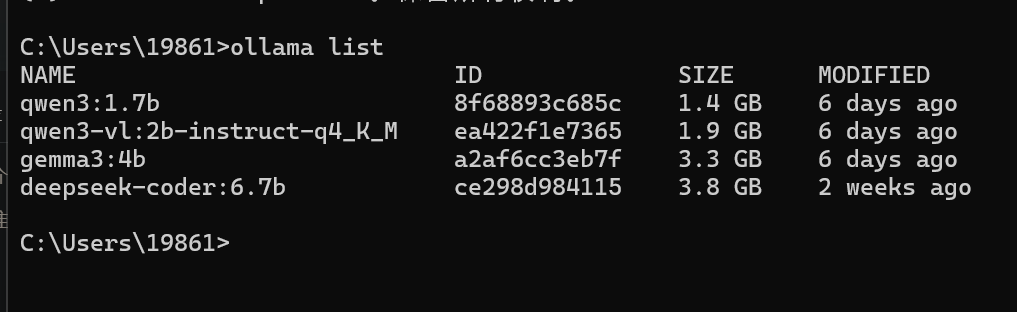 下载后试着安装几个ollama模型,首先要确认好自己电脑的显卡和内存配置。可以让AI给你智能推荐。我下了这几个模型,我的电脑没有独显就选一些小模型。