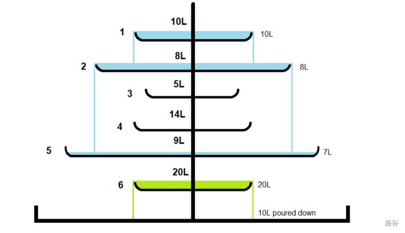 首先,我们可以从圆盘的性质入手:我们发现,如果某个圆盘的水会溢出,那么多出的水会流向它下面第一个半径比它大的圆盘。这让你想到了什么?