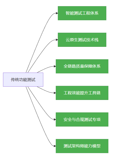 以下将系统解析未来三年测试工程师必须掌握的六大硬核技术维度,并配以 Mermaid 图示辅助理解,为行业从业者提供清晰的学习路线图与发展方向。以下是未来测试技术栈的整体演进方向: