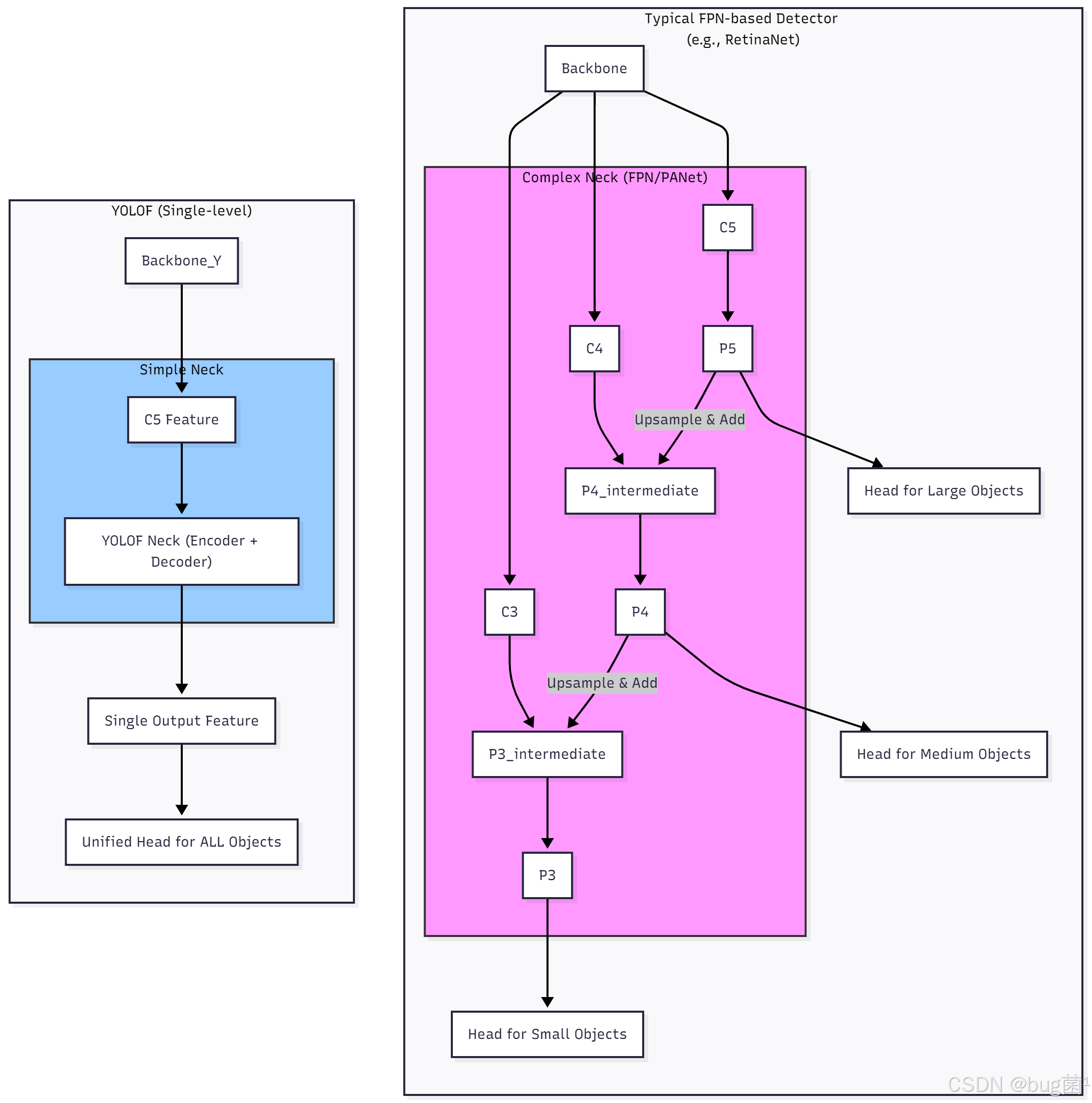 如果只用单一特征层(比如ResNet的C5层,感受野很大)去同时优化这两类目标,检测头会陷入“两难”:它很难学习到一组参数,既能很好地识别大目标,又能很好地识别小目标。这就好比让一个只擅长看远景的望远镜,去同时看清远处的山和近处的蚂蚁,任务本身就充满了矛盾。