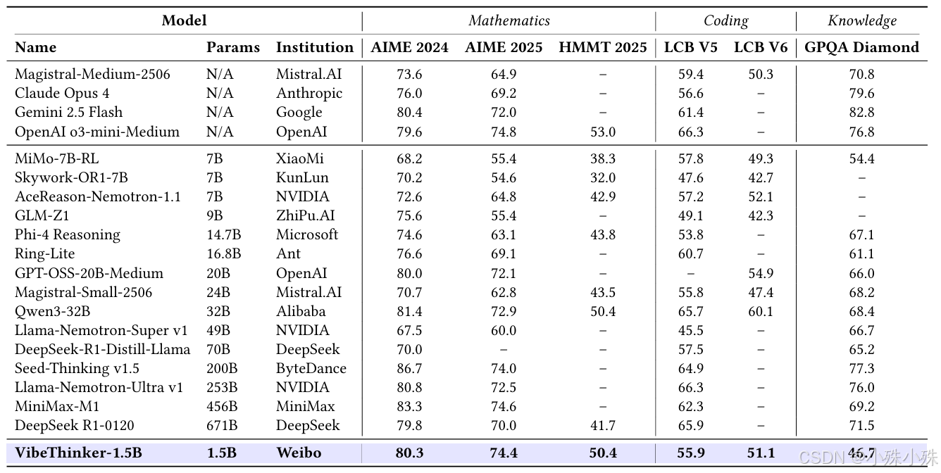 当整个AI行业都在追逐"更大即更强"的 scaling law 时,微博AI团队带来的VibeThinker-1.5B却用实实在在的数据告诉我们:小模型,同样可以拥有大智慧。这个仅有15亿参数的"小个子",在AIME2025数学竞赛中斩获74.4分,超越了参数量400倍于它的DeepSeek R1;在代码生成任务上,它以51.1分的成绩小幅领先Magistral Medium。更令人惊叹的是,这一切的实现成本不到8000美元。
