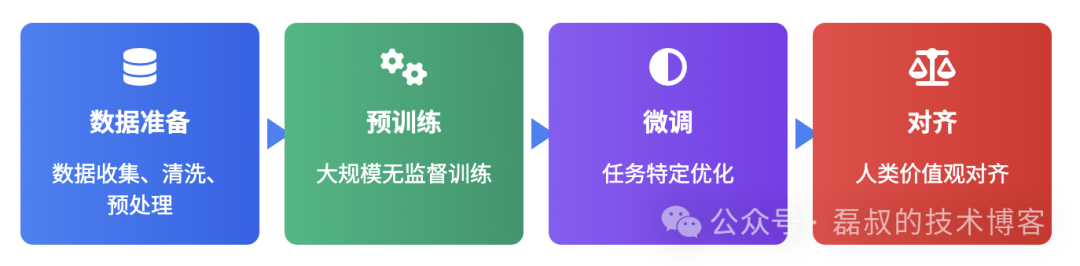 | 1、学习通用语言表示 2、掌握基础语言模式 3、建立世界知识基础 4、形成语言生成能力 | 1、自监督学习方式 2、下一个词预测任务 3、大规模数据训练 4、长时间持续训练 |
