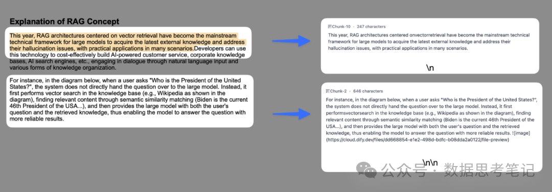 分段标识符:如\n,可以遵循正则表达式语法自定义分块规则,系统将在文本出现分段标识符时自动执行分段。下图是不同语法的文本分段效果: