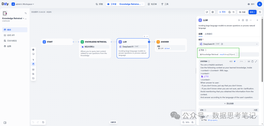 在“LLM”组件中设置模型类型及将知识库检索结果作为上下文: