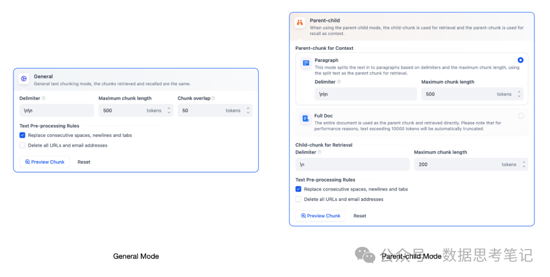 两者的主要区别在于内容区块的分段形式。通用模式的分段结果为多个独立的内容分段,而父子模式采用双层结构进行内容分段,即单个父分段的内容(文档全文或段落)内包含多个子分段内容(句子)。