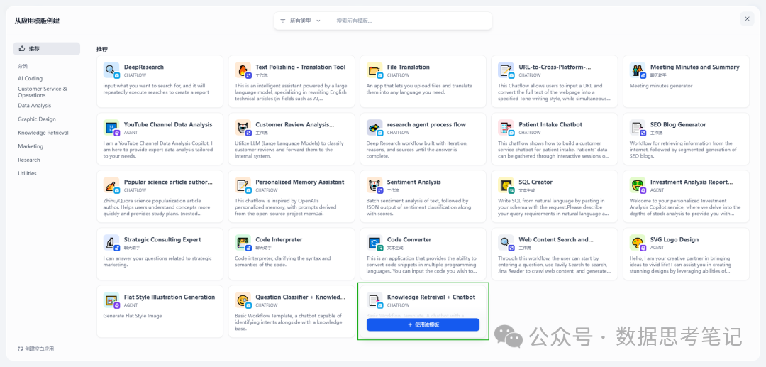 运用Dify内置的应用模板创建基于知识库的问答系统,“工作室”—“从应用模板创建”—“Knowledge Retreival + Chatbot”: