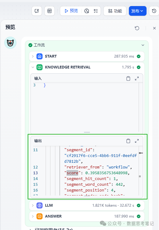 设置完成后进行预览测试,可在工作流中查看每一步的运行情况,在“Knowledge Retrieval”输出中可查看知识库的检索结果: