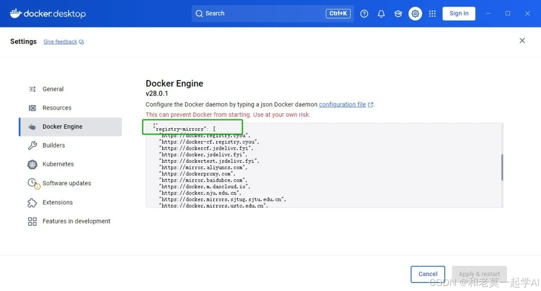 { "builder":{ "gc":{ "defaultKeepStorage":"20GB", "enabled":true } }, "debug":false, "experimental":false, "features":{ "buildkit":true }, "insecure-registries":[ "registry.docker-cn.com", "docker.mirrors.ustc.edu.cn" ], "registry-mirrors":[ "https://mirror.aliyuncs.com", "https://dockerproxy.com", "https://mirror.baidubce.com", "https://docker.m.daocloud.io", "https://docker.nju.edu.cn", "https://docker.mirrors.sjtug.sjtu.edu.cn", "https://docker.mirrors.ustc.edu.cn", "https://dockerproxy.com", "https://registry.docker-cn.com", "http://hub-mirror.c.163.com", "http://mirrors.ustc.edu.cn/", "https://mirrors.tuna.tsinghua.edu.cn/" ]}