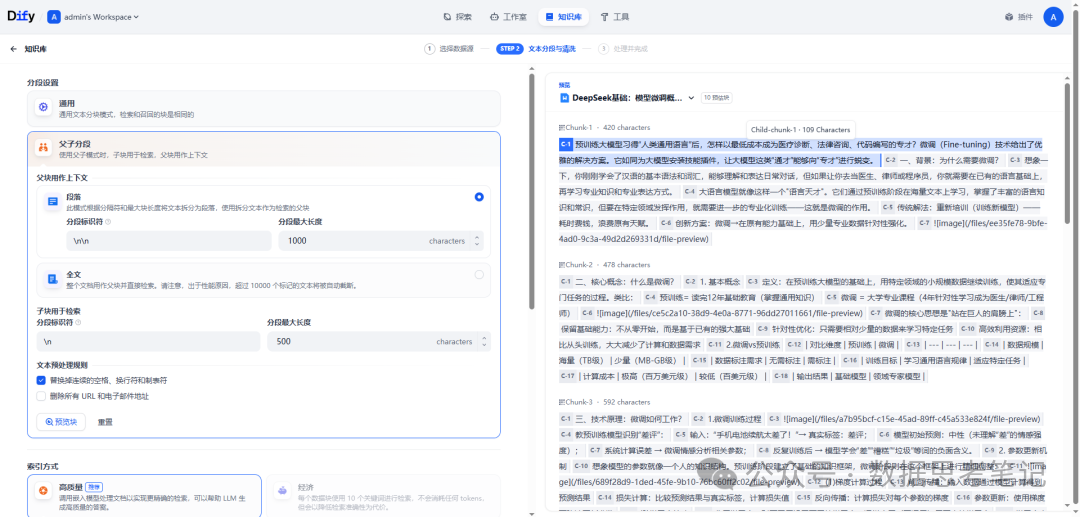 配置完成后,点击“预览区块”即可查看分段后的效果。可以查看父分段的整体字符数。背景标蓝的字符为子分块,同时显示当前子段的字符数。