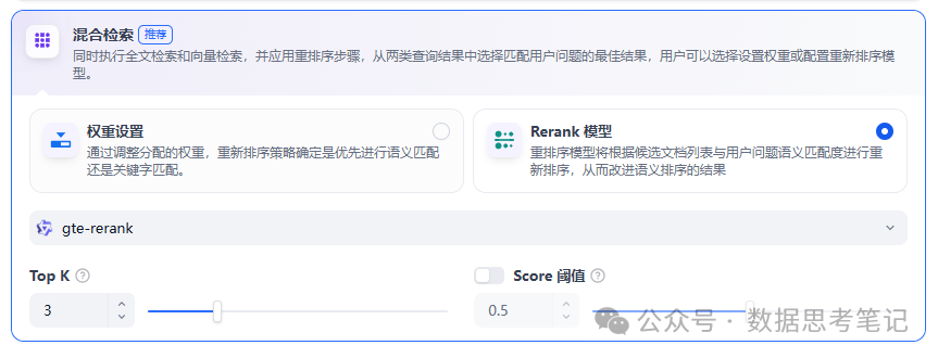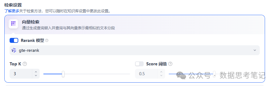 Rerank模型:默认关闭,开启后将使用第三方Rerank模型再一次重排序由混合检索召回的内容分段,以优化排序结果。