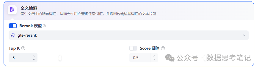 Rerank 模型: 默认关闭。开启后将使用第三方Rerank模型再一次重排序由全文检索召回的内容分段,以优化排序结果。向LLM发送经过重排序的分段,辅助其提升输出的内容质量。