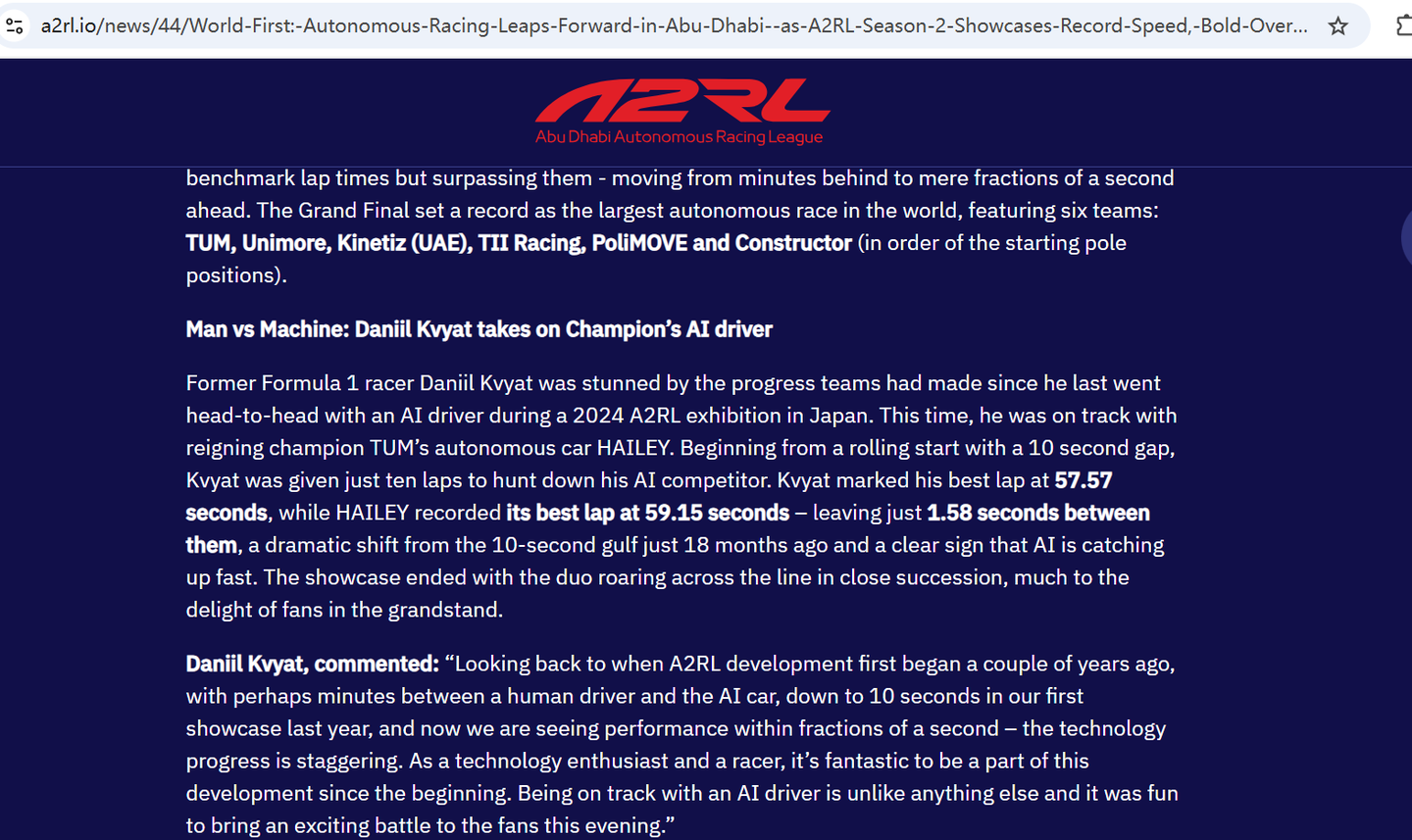 最近A2RL(阿布扎比自动驾驶赛车联赛)终于完赛,没错,就是那个近似IAC (印第安纳波利斯自动驾驶挑战赛)的比赛。
