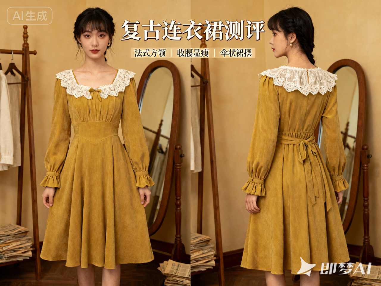 即梦AI:能精准抓我要的风格,比如做“复古连衣裙测评”,它会自动优化裙摆的褶皱细节,背景也是复古镜子还会加一些报纸点缀,比我自己拍的还有氛围感,用这张图的笔记点赞比之前多了2倍。