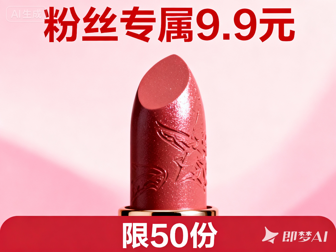 之前做“粉丝福利日”活动,要推一款平价口红,输入描述:“自媒体福利海报,顶部加‘粉丝专属9.9元’红色艺术字,底部放‘限50份’倒计时,背景用粉色渐变,保持口红的膏体质感”。