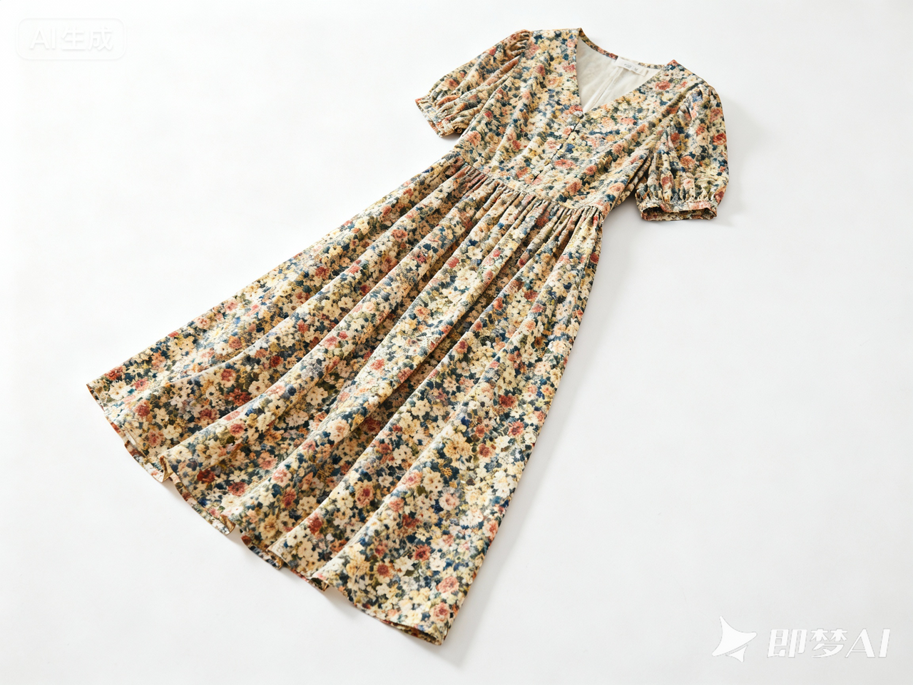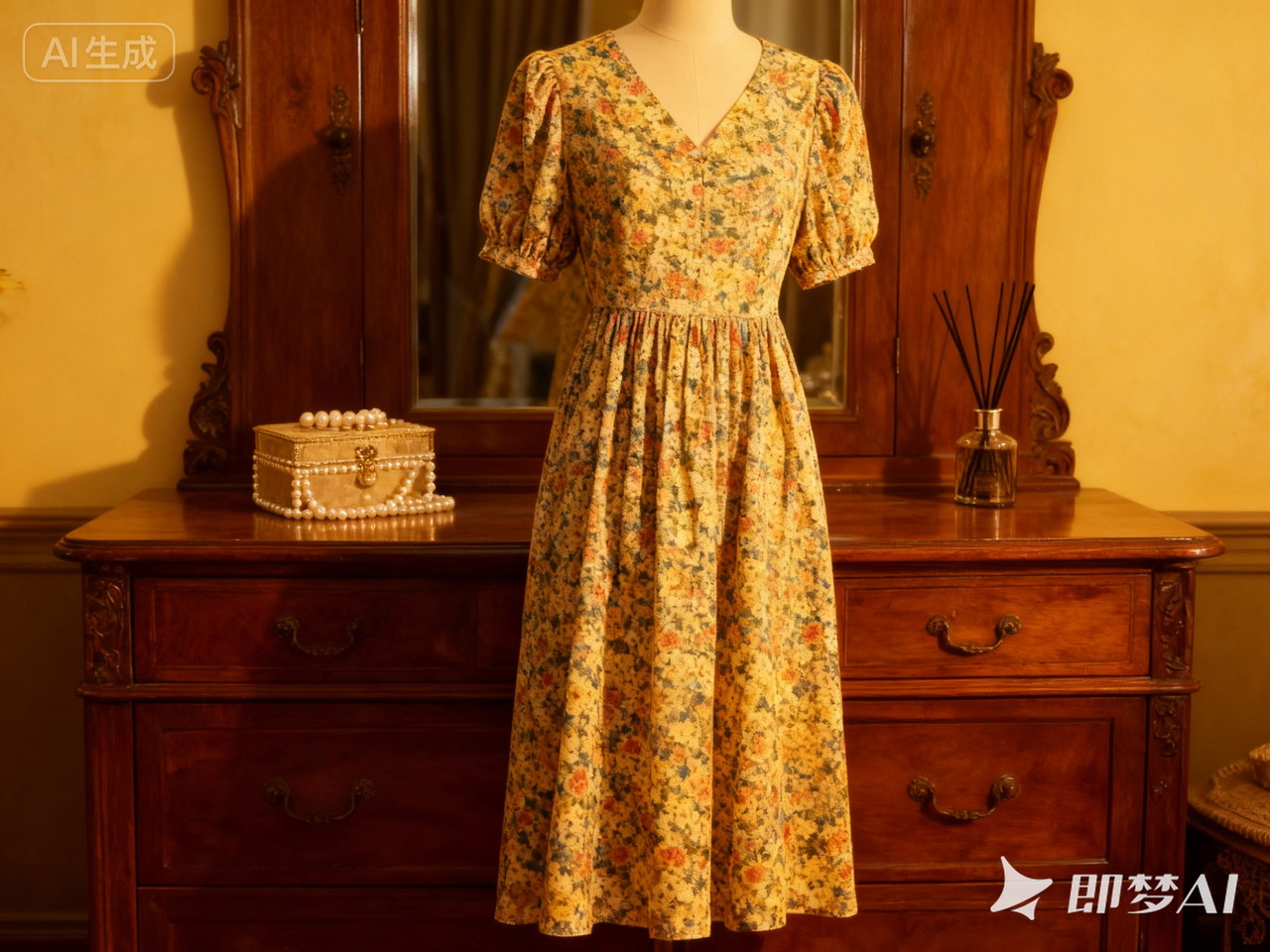 原图是白底平铺的复古碎花裙,输入描述:“穿搭测评主图,背景换成复古木质梳妆台,摆个珍珠首饰盒和香薰,突出裙子的碎花质感,色调偏暖黄”