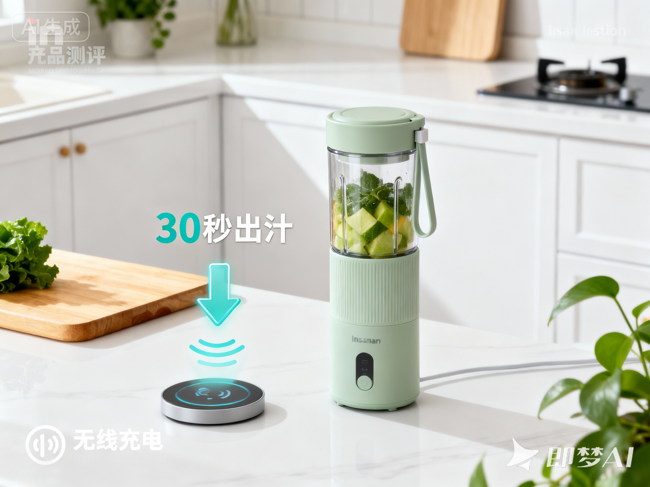 原图是一款便携榨汁杯,输入描述:“好物测评图,在杯子旁边加‘30秒出汁’的动态图标,左下角标‘无线充电’符号,背景用ins风厨房场景,色调清新”。