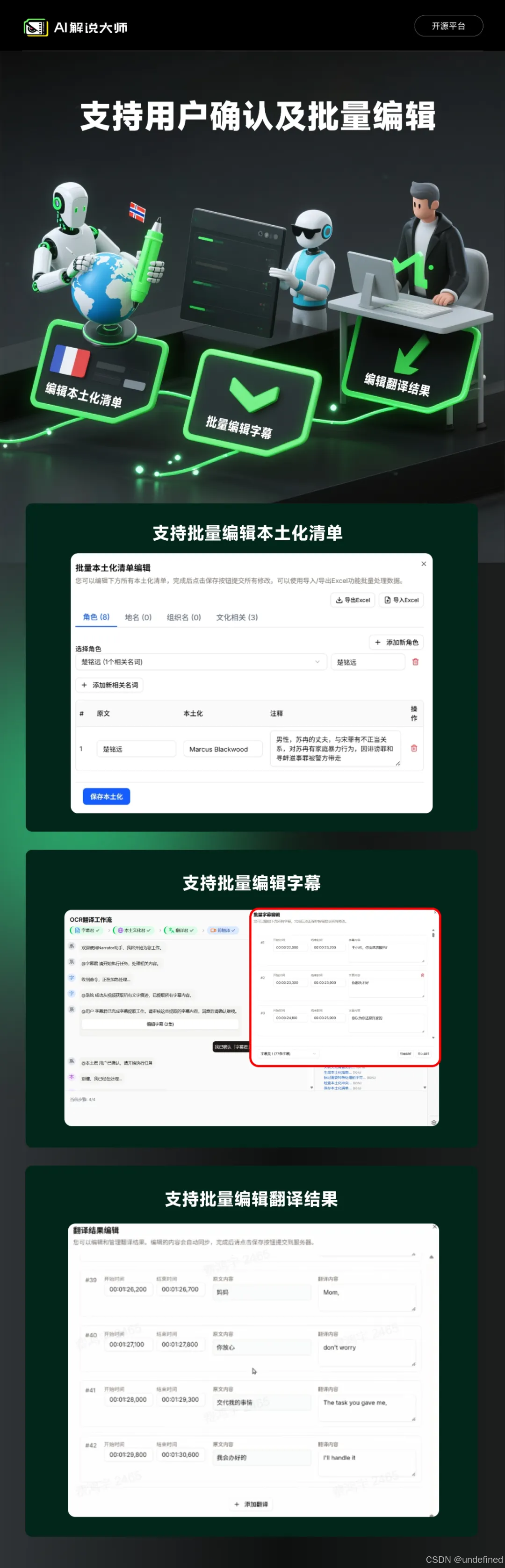 AI视频翻译、字幕提取、字幕擦除、视频本地化、短剧翻译、多语言字幕、SRT翻译、VTT字幕、字幕生成、AI字幕工具、视频翻译API、OCR字幕识别、硬字幕去除、视频多语言版本、短剧出海、AI解说、字幕压制、无痕擦除、视频配音翻译、AI字幕处理、开源翻译框架、NarratorAI、AI解说大师、视频自动翻译、东南亚小语种翻译、影视本地化、字幕自动对齐、AI短剧制作、视频翻译工具推荐、字幕自动化流程、视频全球化
