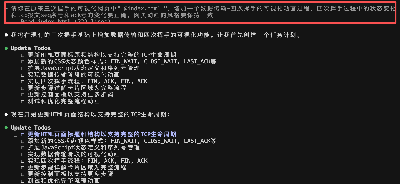 当然,TCP 远不止连接建立这个过程,所以我继续提了新要求,让它把数据传输+四次挥手的过程也增加到网页中字,这样学习 TCP 连接的生命周期就更完整了。