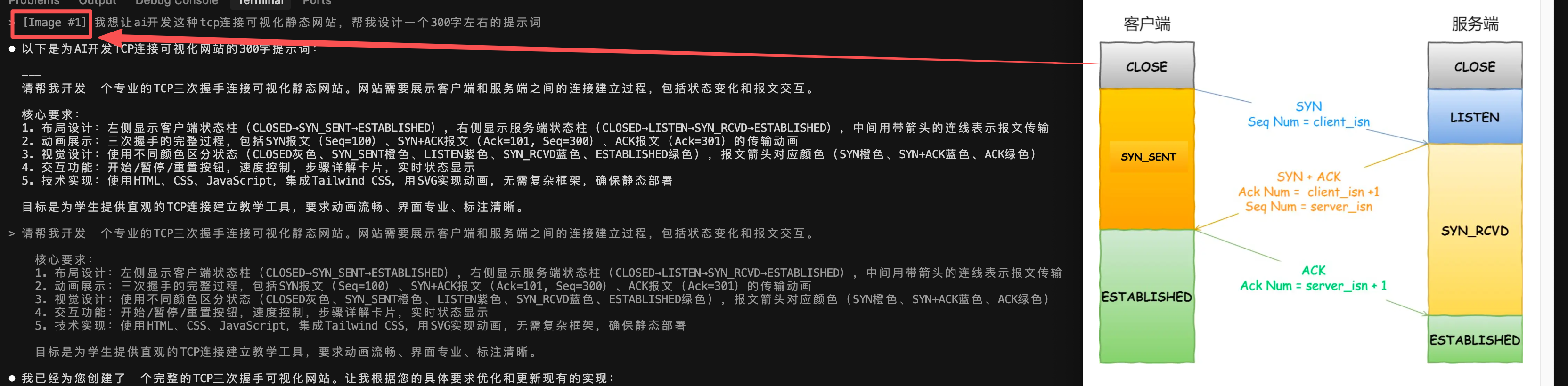 我没有上来就写一堆蹩脚的需求文档,而是干了一件特别省事的操作:我直接把我《图解网络》里那张「TCP 三次握手」的插图截图,丢给了 GLM-4.6。