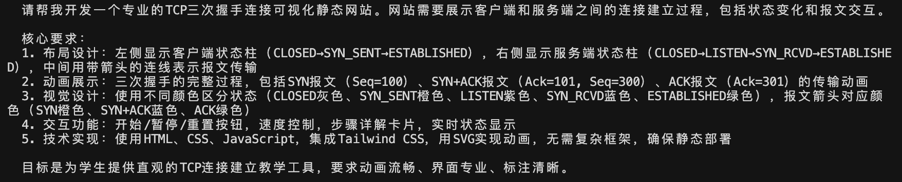 通常来说,多轮修改很容易让 AI 生成的代码「崩坏」,比如风格不统一或者逻辑冲突。但 GLM-4.6 稳得一塌糊涂,它不仅理解了「保持网页动画风格一致」这个隐性需求,还把 TCP 连接的完整生命周期,从握手到传输再到挥手,完美地串联在了一起。