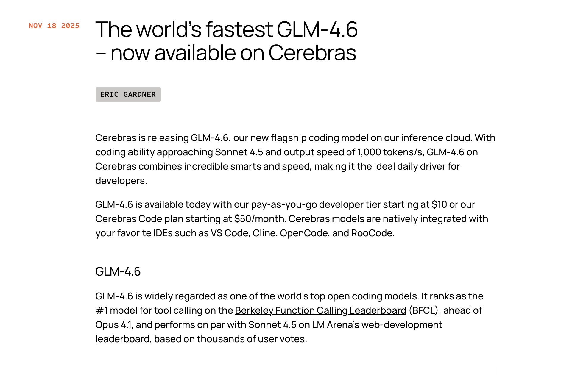 连国外的芯片巨头 Cerebras 都宣布把 GLM-4.6 作为默认推荐模型。这说明在硬核的技术圈子里,它已经开始走向全球开发者生态,成为了一个通用的选项。