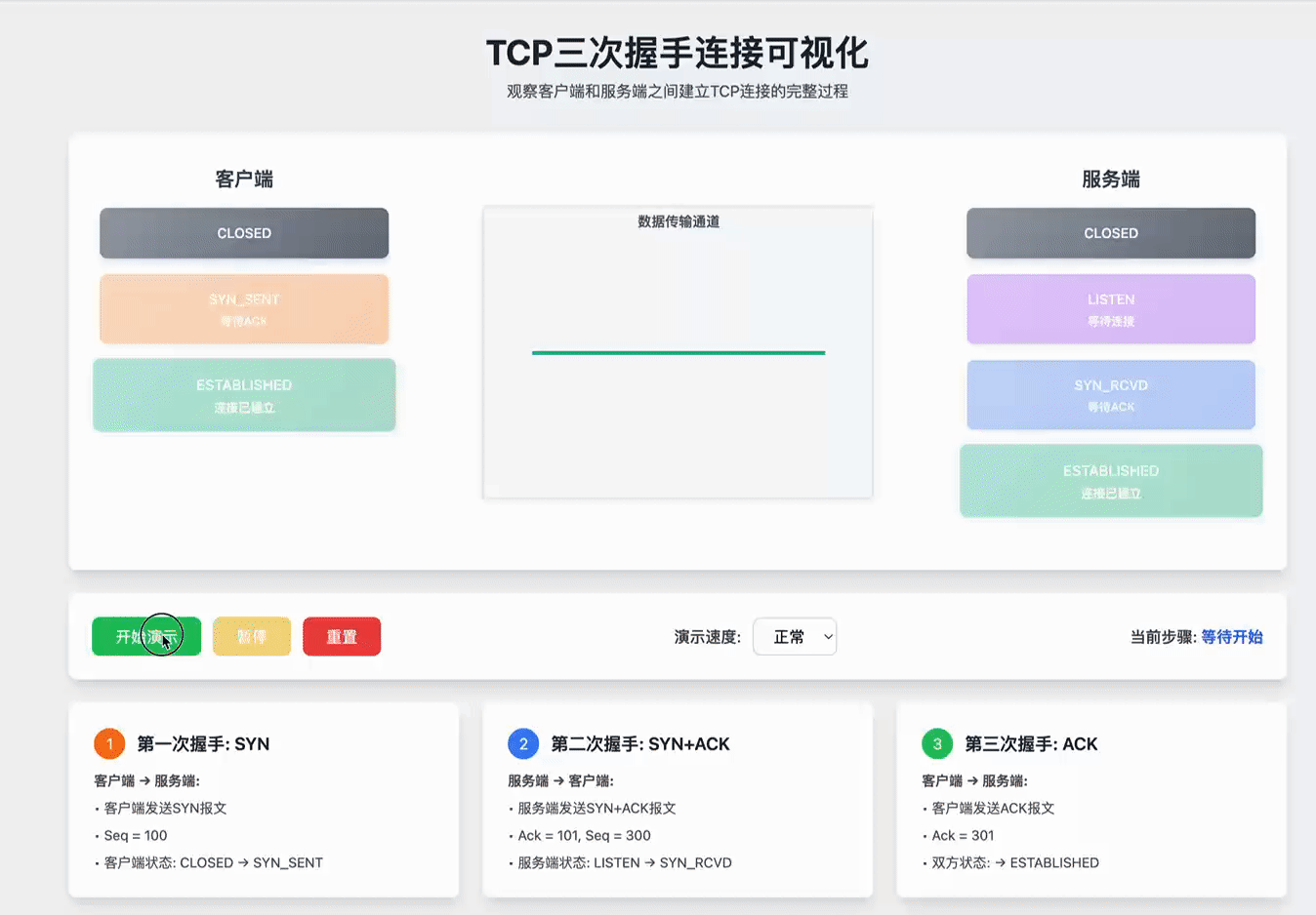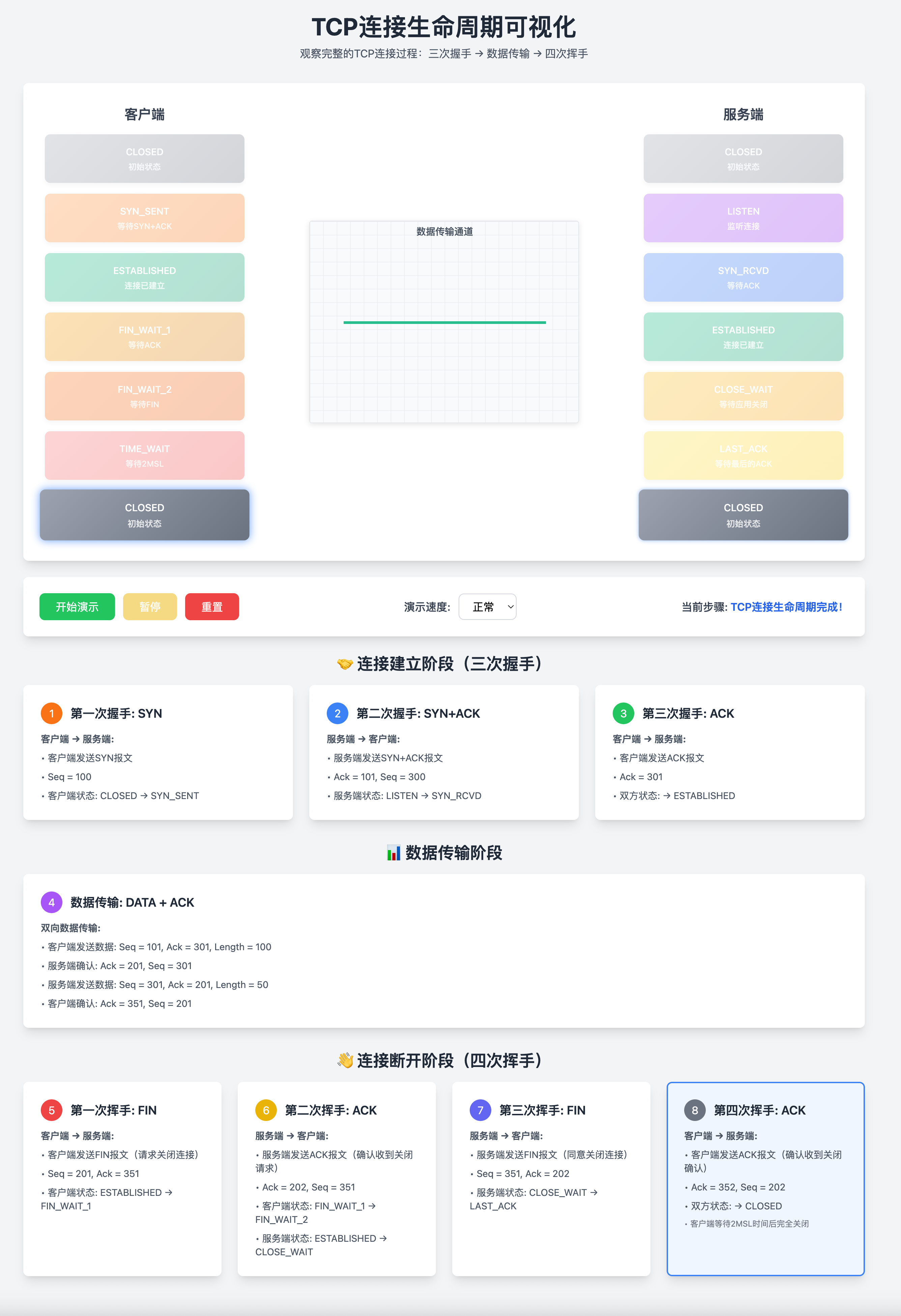 上半部分是丝滑的动画演示,下半部分是实时的状态说明。我看着屏幕上那个自动流转的 TCP 状态机,心里就在想,这不就是我梦寐以求的可视化学习网页吗