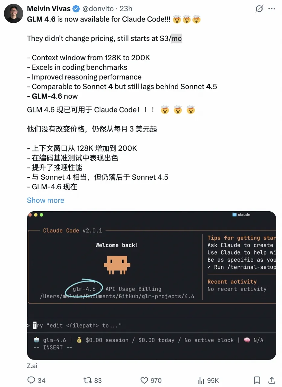 看到个很有意思的事,知名博主 Melvin Vivas 发现,GLM-4.6 可以丝滑接入 Claude Code 开发环境,再加上价格实在便宜,都已经改用 GLM-4.6 了